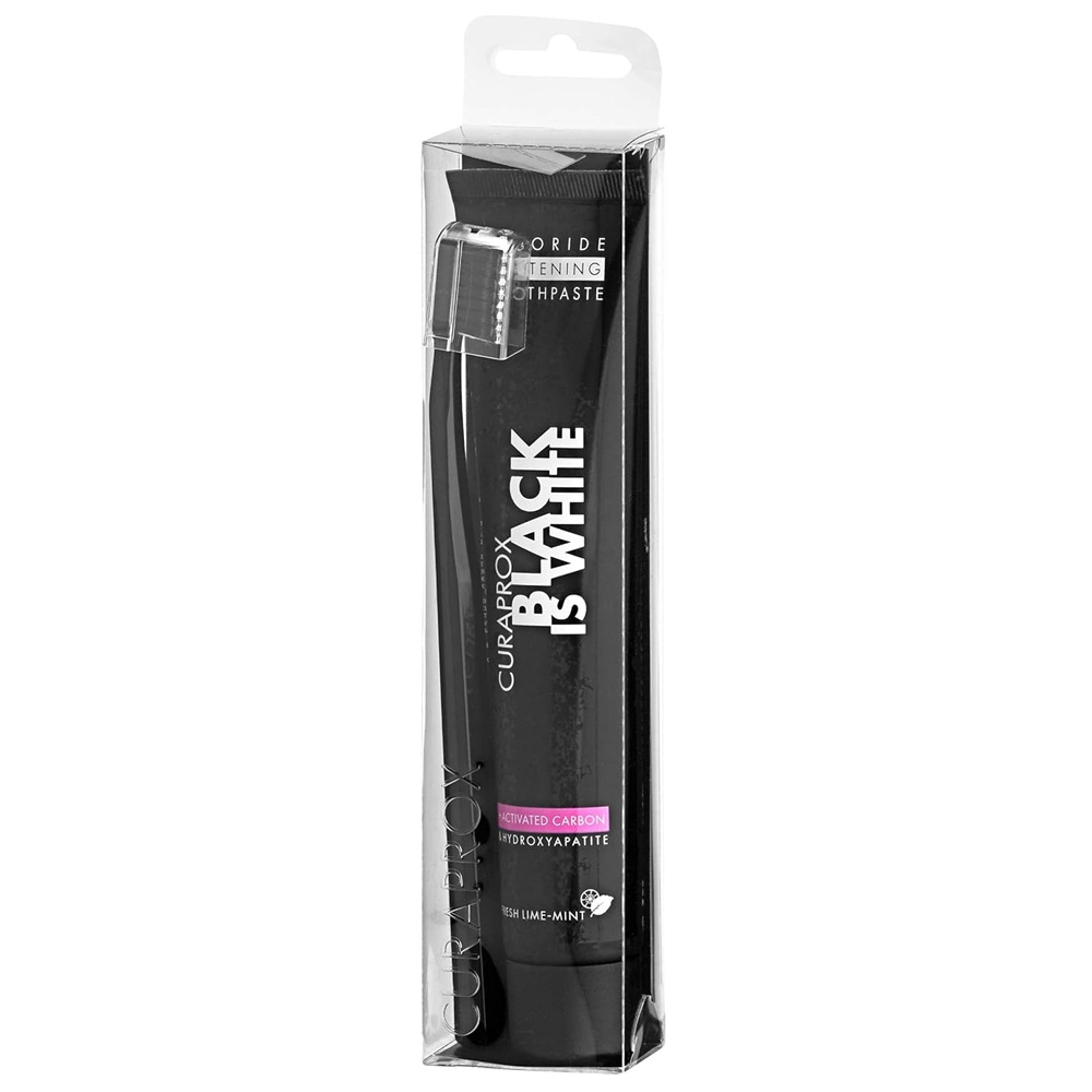 Curaprox Black Is White to nowoczesny zestaw do codziennej higieny jamy ustnej, który łączy wybielającą pastę z aktywnym węglem oraz ultramiękką szczoteczkę. Zapewnia skuteczne oczyszczanie, ochronę szkliwa i stopniowe rozjaśnianie zębów – bez agresywnych metod.