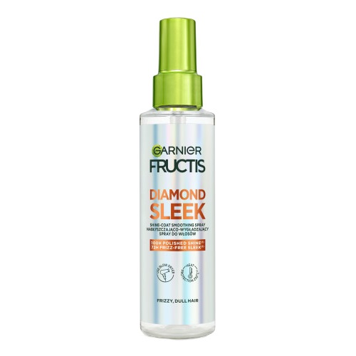 Dzięki [KERATYNOWEMU KOMPLEKSOWI WYGŁADZAJĄCEMU + OLEJKOWI ARGANOWEMU] Garnier Fructis Diamond Sleek Spray chroni i wygładza włosy, redukując puszenie się nawet przy bardzo wysokiej wilgotności. Otula włókna włosów, wzmacniając odbijanie się światła pod każdym kątem, dla zapewnienia diamentowego blasku.