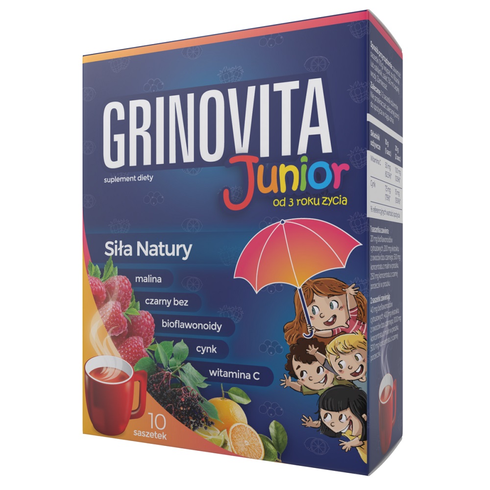 Grinovita Junior zawiera w przeliczeniu na jedną saszetkę 62,5% dziennej dawki witaminy C i 75% dziennej dawki cynku, wyciąg z owoców czarnego bzu, naturalne koncentraty soków z malin i czarnej porzeczki, co sprawia, że Grinovita Junior stanowi cenne uzupełnienie diety dziecka.