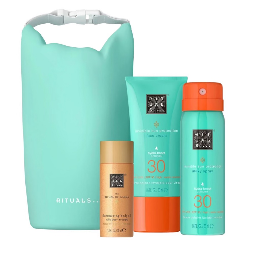 The Ritual of Karma zestaw błyszczący olejek do ciała 30ml + krem do twarzy SPF30 50ml + mleczko do opalania w sprayu SPF30 50ml